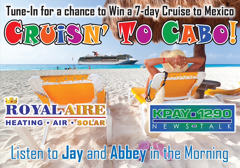 CRUISIN' TO CABO CONTEST ends June 12. Listen for your cue to call.Sponsored: Royal Aire Heating & Air ConditioningWatch for our TV commercials on the following stations: KHSL TV12 | KNVN TV24 | Action News Now | CW10Production: Engelbrecht Advertising